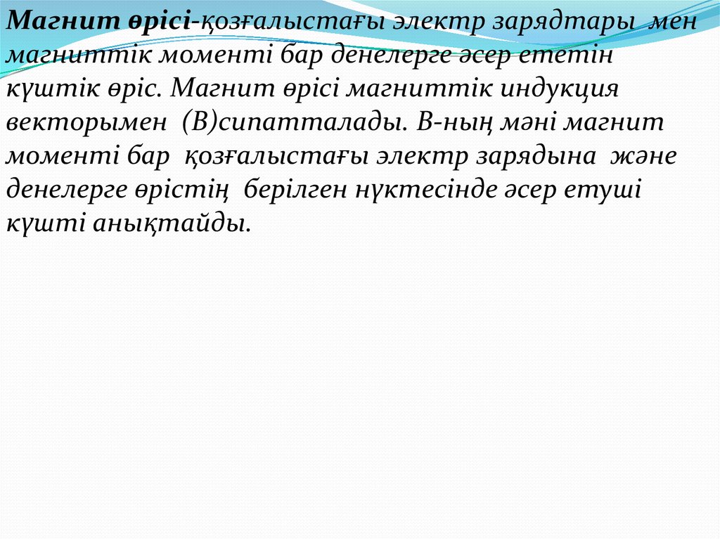 Магнит өрісі-қозғалыстағы электр зарядтары менмагниттік моменті бар денелерге әсер ететін