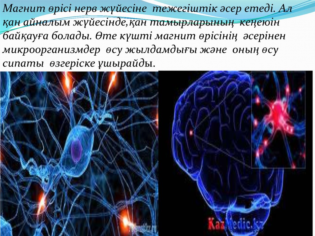 Магнит өрісі нерв жүйесіне тежегіштік әсер етеді. Алқан айналым жүйесінде,қан тамырларының кеңеюін