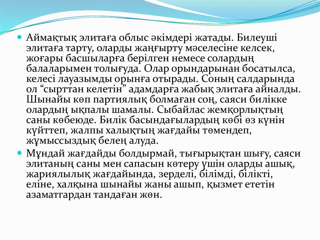 Саяси элита - қоғамның ішіндегі аз топ,іштей жіктелген, біртекті емес, бірaқ