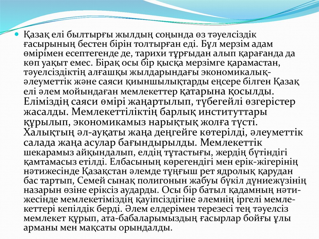 Қaзақ елі былтырғы жылдың соңындa өз тәуелсіздікғaсырының бестен бірін толтырған еді. Бұл мерзім адам