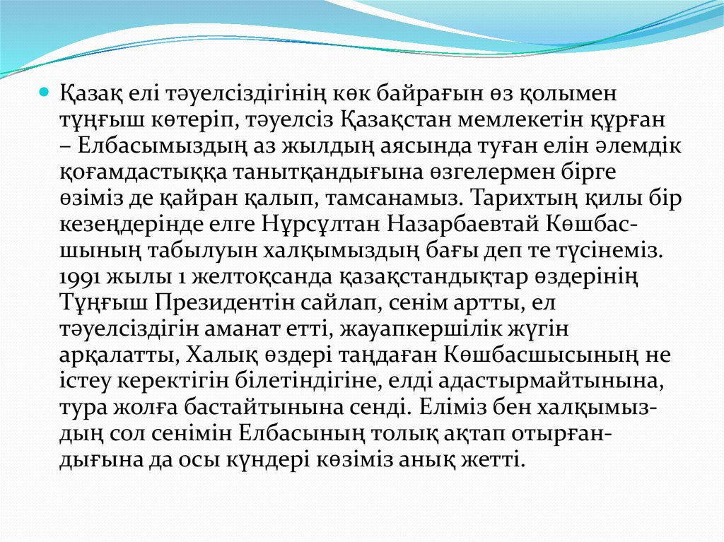 кезеңдерінде елге Нұрсұлтан Назарбаевтай Көшбасшының табылуын халқымыздың бағы деп те түсінеміз.