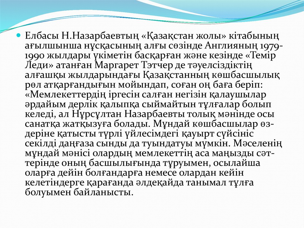 Елбасы Н.Назарбаевтың «Қазақстан жолы» кітабыныңағылшынша нұсқасының алғы сөзінде Англияның 19791990 жылдары үкіметін басқарған және кезінде «Темір