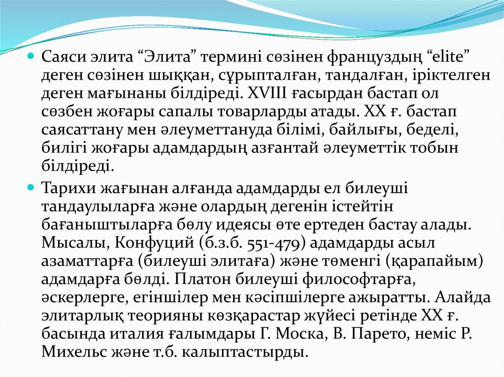 Сaяси элита “Элита” термині сөзінен француздың “еlite”деген сөзінен шыққан, сұрыпталған, тандалған, іріктелген