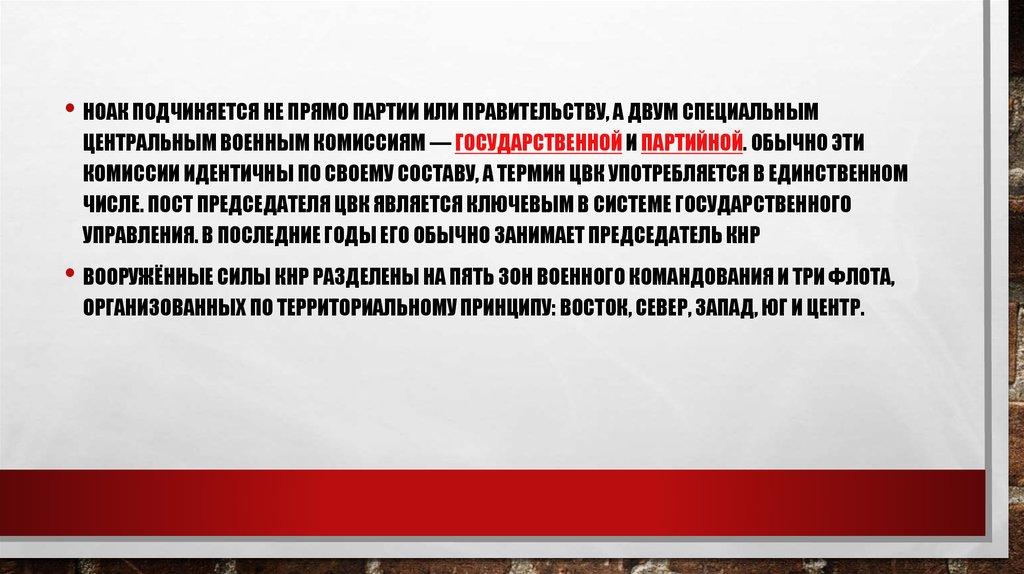 • НОАК ПОДЧИНЯЕТСЯ НЕ ПРЯМО ПАРТИИ ИЛИ ПРАВИТЕЛЬСТВУ, А ДВУМ СПЕЦИАЛЬНЫМЦЕНТРАЛЬНЫМ ВОЕННЫМ КОМИССИЯМ — ГОСУДАРСТВЕННОЙ И ПАРТИЙНОЙ. ОБЫЧНО ЭТИ