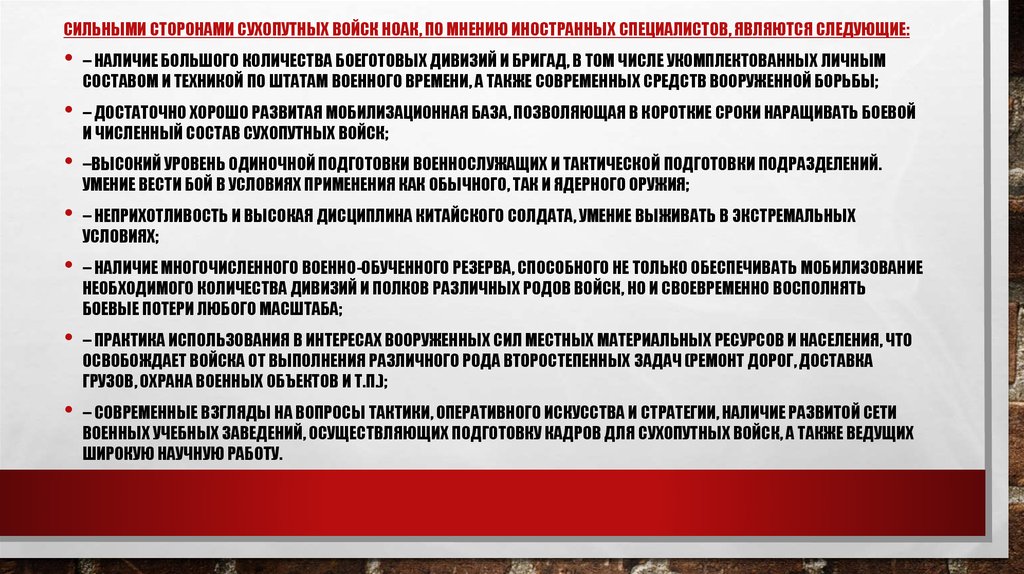 СИЛЬНЫМИ СТОРОНАМИ СУХОПУТНЫХ ВОЙСК НОАК, ПО МНЕНИЮ ИНОСТРАННЫХ СПЕЦИАЛИСТОВ, ЯВЛЯЮТСЯ СЛЕДУЮЩИЕ:– НАЛИЧИЕ БОЛЬШОГО КОЛИЧЕСТВА БОЕГОТОВЫХ ДИВИЗИЙ И БРИГАД, В ТОМ ЧИСЛЕ УКОМПЛЕКТОВАННЫХ ЛИЧНЫМ