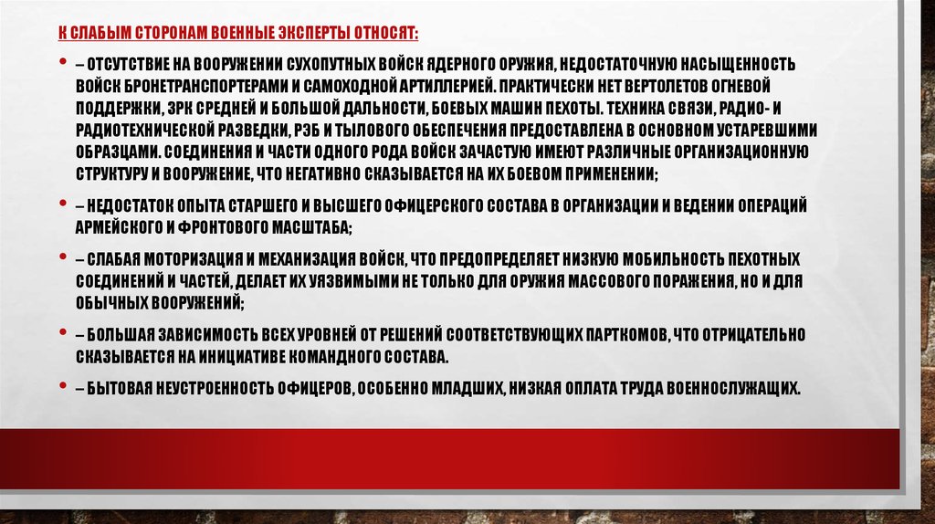 К СЛАБЫМ СТОРОНАМ ВОЕННЫЕ ЭКСПЕРТЫ ОТНОСЯТ:– ОТСУТСТВИЕ НА ВООРУЖЕНИИ СУХОПУТНЫХ ВОЙСК ЯДЕРНОГО ОРУЖИЯ, НЕДОСТАТОЧНУЮ НАСЫЩЕННОСТЬ
