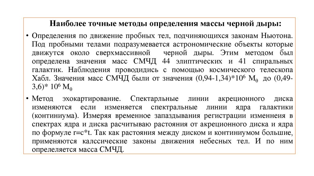 Наиболее точные методы определения массы черной дыры:• Определения по движение пробных тел, подчиняющихся законам Ньютона.