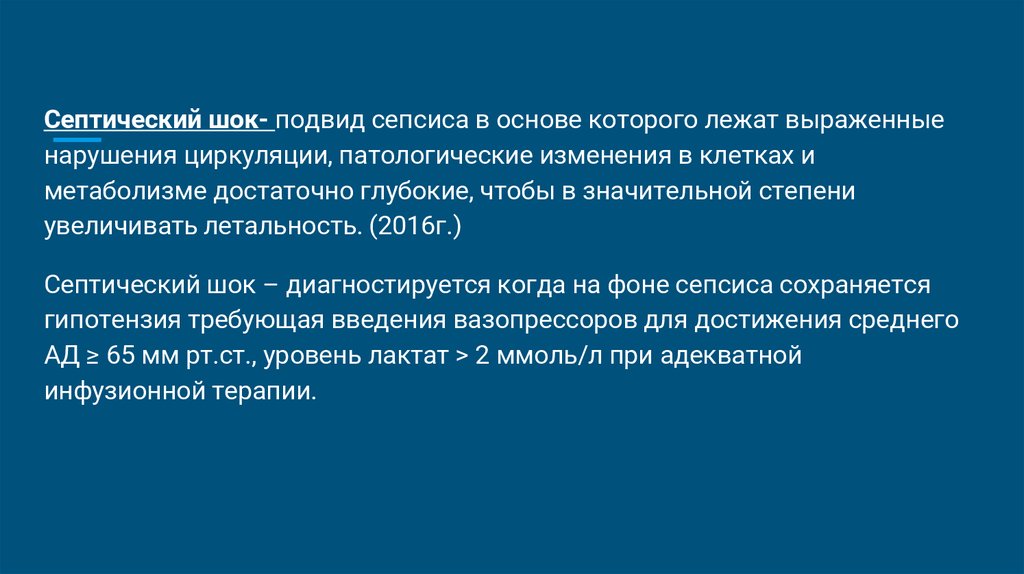 Септический шок – диагностируется когда на фоне сепсиса сохраняется