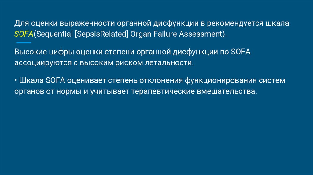 • Шкала SOFA оценивает степень отклонения функционирования систем
