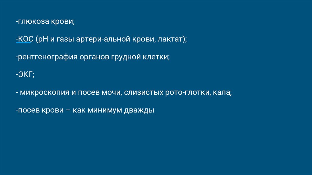 -глюкоза крови;-КОС (рН и газы артери-альной крови, лактат);