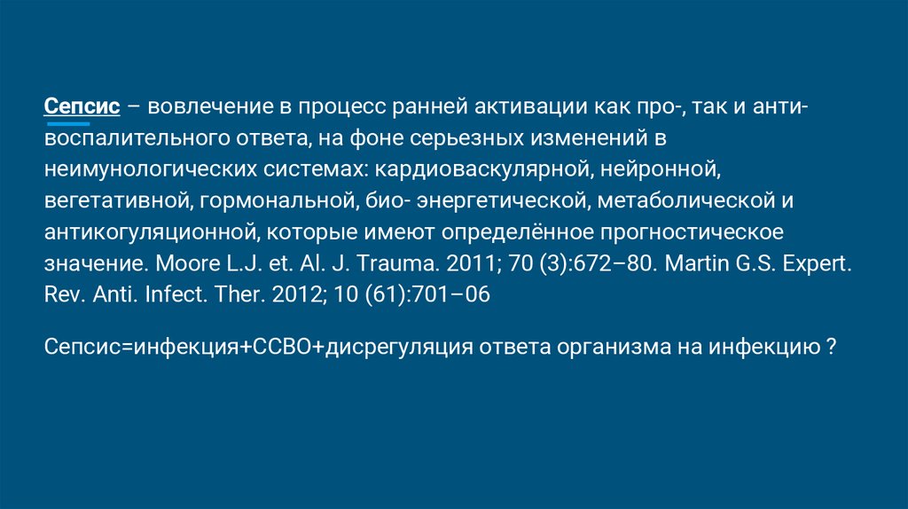 Сепсис – вовлечение в процесс ранней активации как про-, так и антивоспалительного ответа, на фоне серьезных изменений внеимунологических системах: кардиоваскулярной, нейронной,