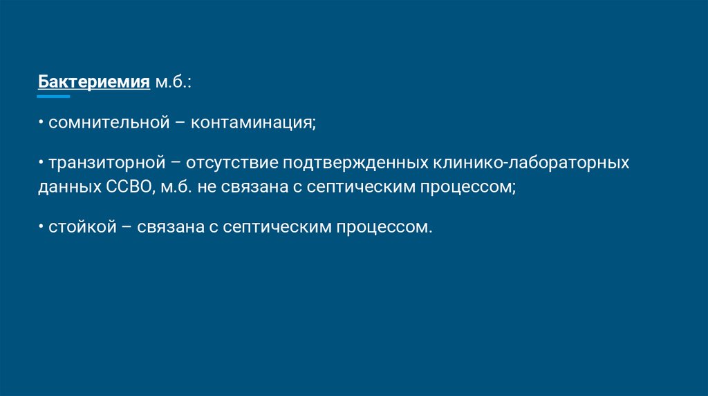 Бактериемия м.б.:• сомнительной – контаминация;