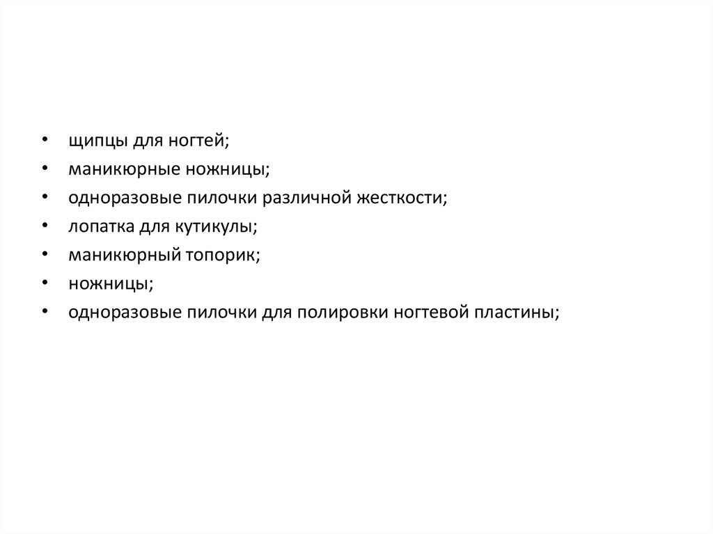 Рабочее место мастера маникюра должно включать след. Предметы…