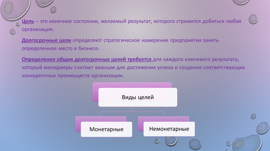 Цель – это конечное состояние, желаемый результат, которого стремится добиться любаяорганизация.