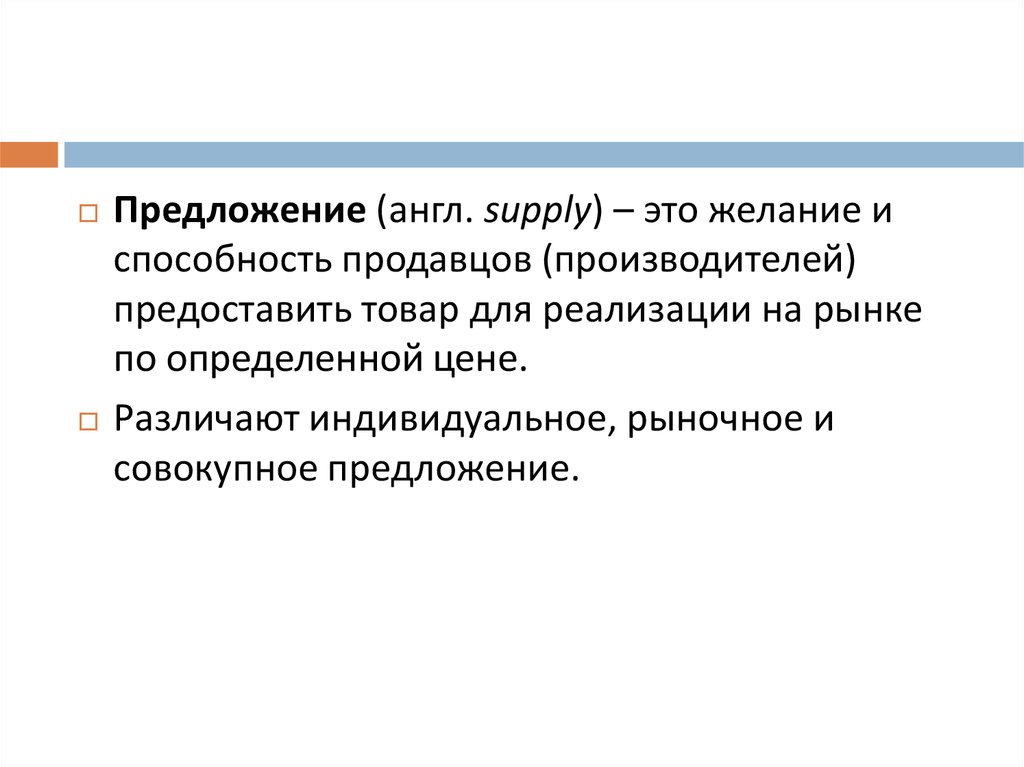 Предложение (англ. supply) – это желание испособность продавцов (производителей)