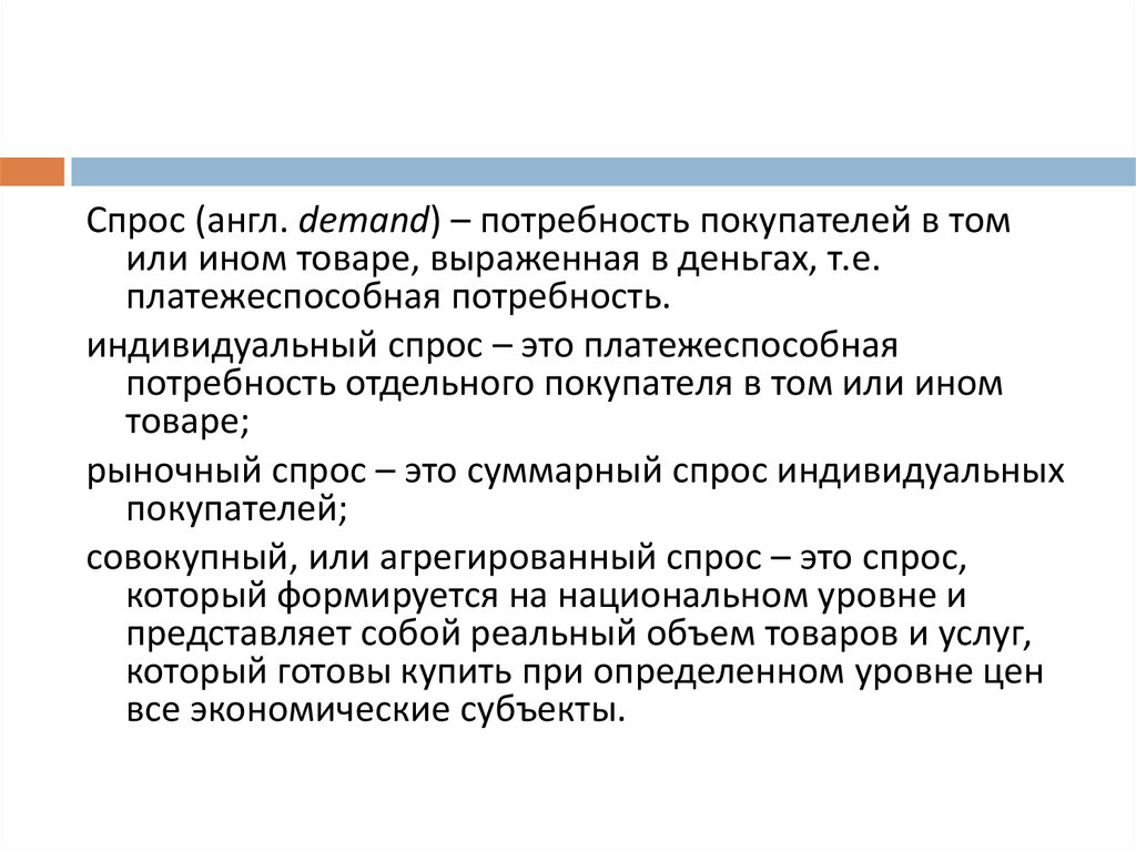 Спрос (англ. demand) – потребность покупателей в томили ином товаре, выраженная в деньгах, т.е.