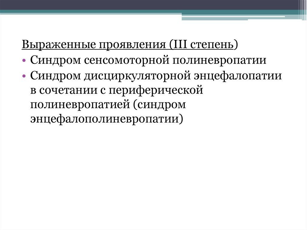 Выраженные проявления (III степень)• Синдром сенсомоторной полиневропатии