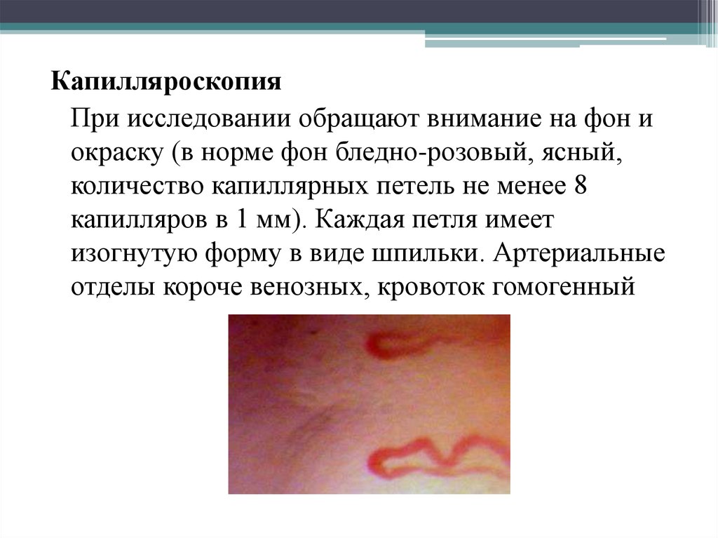 КапилляроскопияПри исследовании обращают внимание на фон и