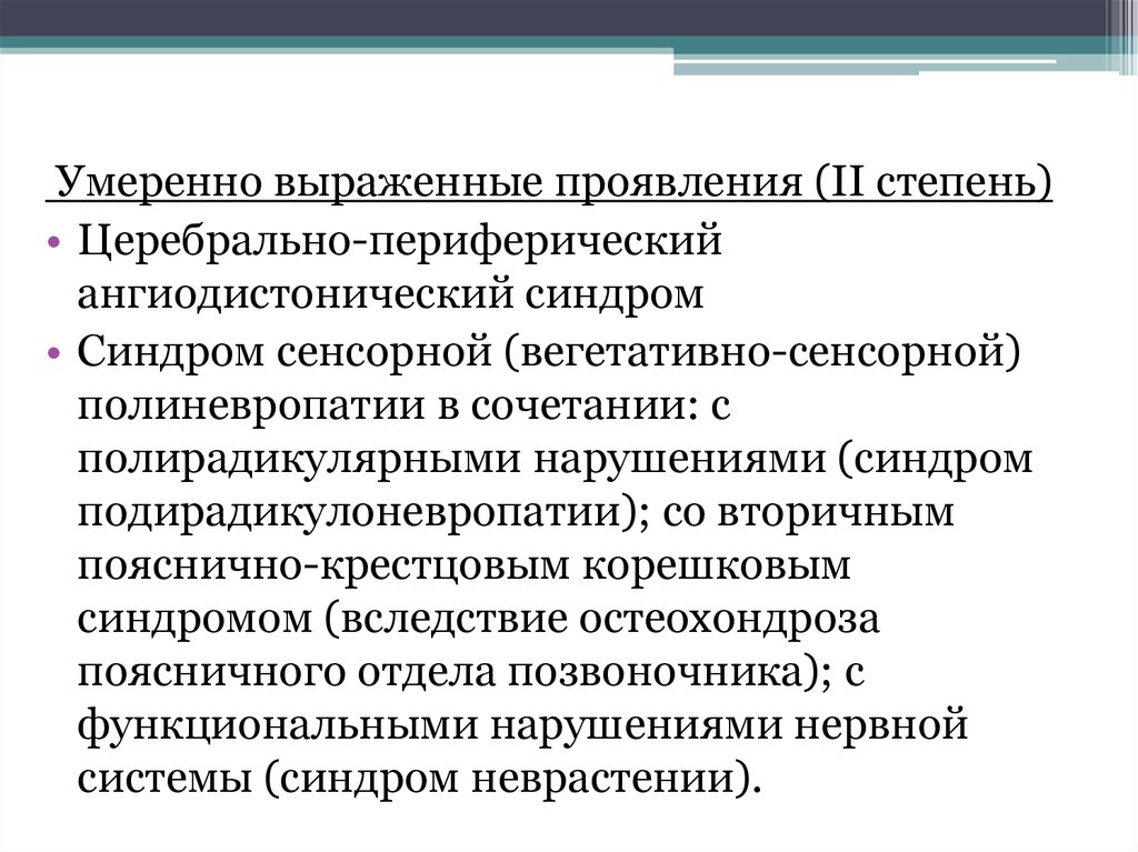 Умеренно выраженные проявления (II степень)• Периферический ангиодистонический синдром