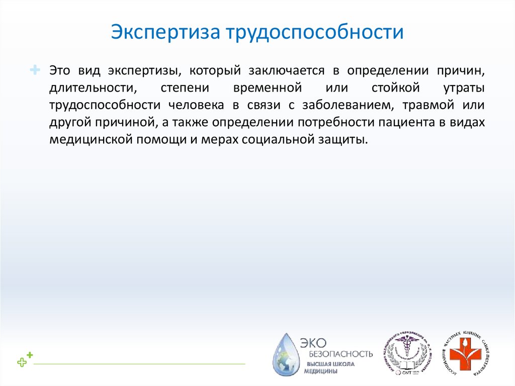 Экспертиза трудоспособностиЭто вид экспертизы, который заключается в определении причин,