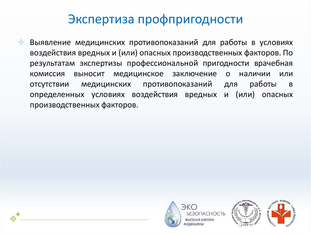 Экспертиза профпригодностиВыявление медицинских противопоказаний для работы в условиях