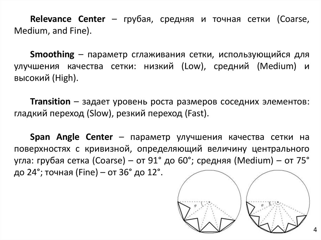 угла: грубая сетка (Coarse) – от 91° до 60°; средняя (Medium) – от 75°