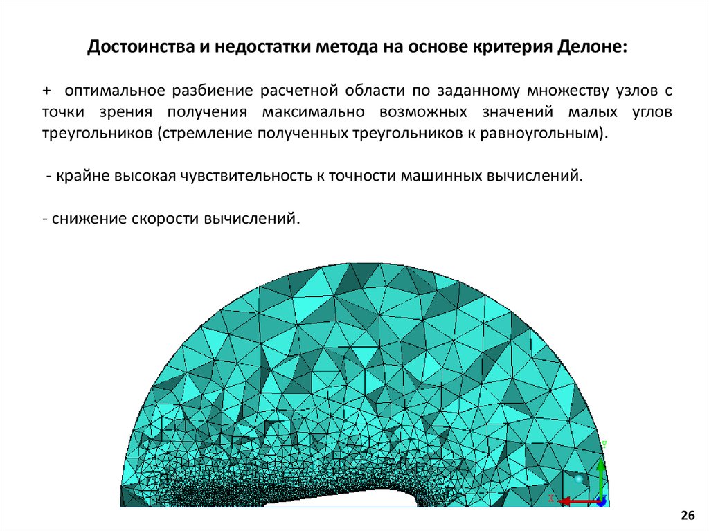 Достоинства и недостатки метода на основе критерия Делоне:+ оптимальное разбиение расчетной области по заданному множеству узлов с