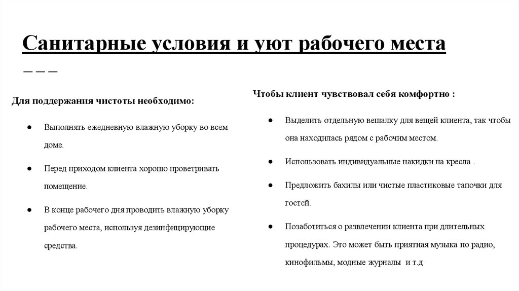 Санитарные условия и уют рабочего местаДля поддержания чистоты необходимо: