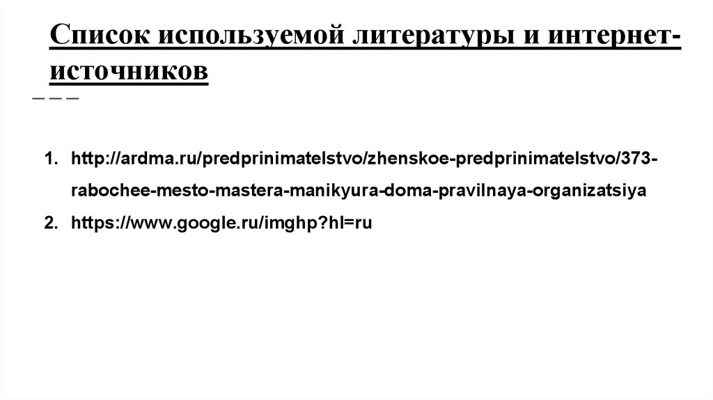 Список используемой литературы и интернетисточников1. http://ardma.ru/predprinimatelstvo/zhenskoe-predprinimatelstvo/373rabochee-mesto-mastera-manikyura-doma-pravilnaya-organizatsiya