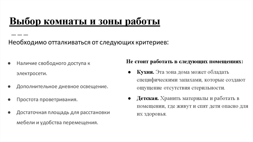 Выбор комнаты и зоны работыНеобходимо отталкиваться от следующих критериев: