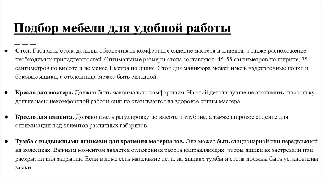 Подбор мебели для удобной работыСтол. Габариты стола должны обеспечивать комфортное сидение мастера и клиента, а также расположение
