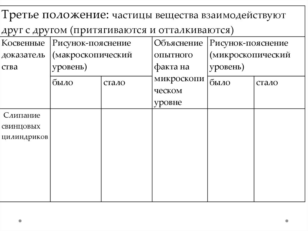 Третье положение: частицы вещества взаимодействуют друг сдругом (притягиваются и отталкиваются)