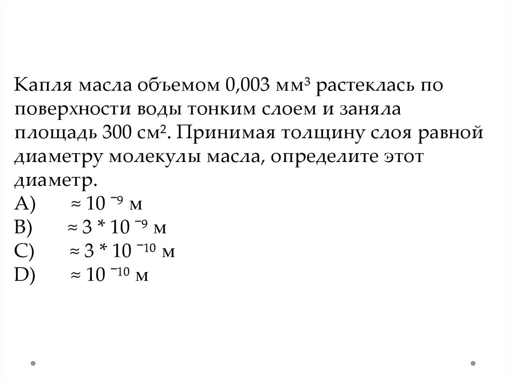 Капля масла объемом 0,003 мм³ растеклась поповерхности воды тонким слоем и заняла