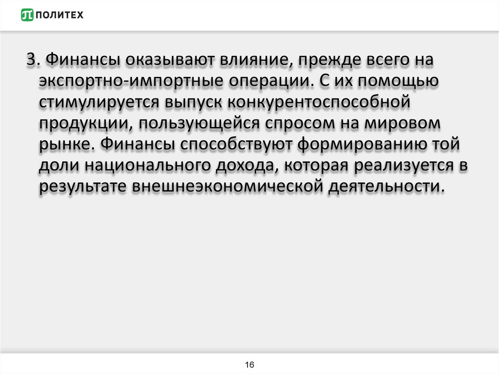 Финансы оказывают влияние, прежде всего на экспортноимпортные операции. С их помощью стимулируется выпуск