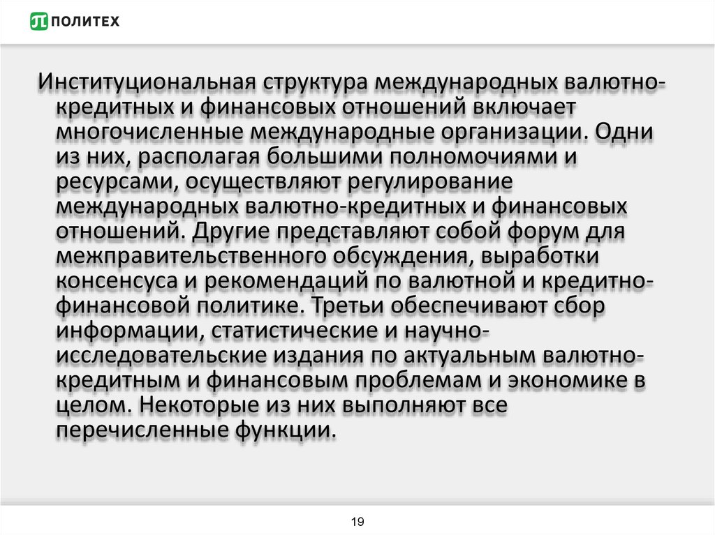 Институциональная структура международных валютнокредитных и финансовых отношений включаетмногочисленные международные организации. Одни