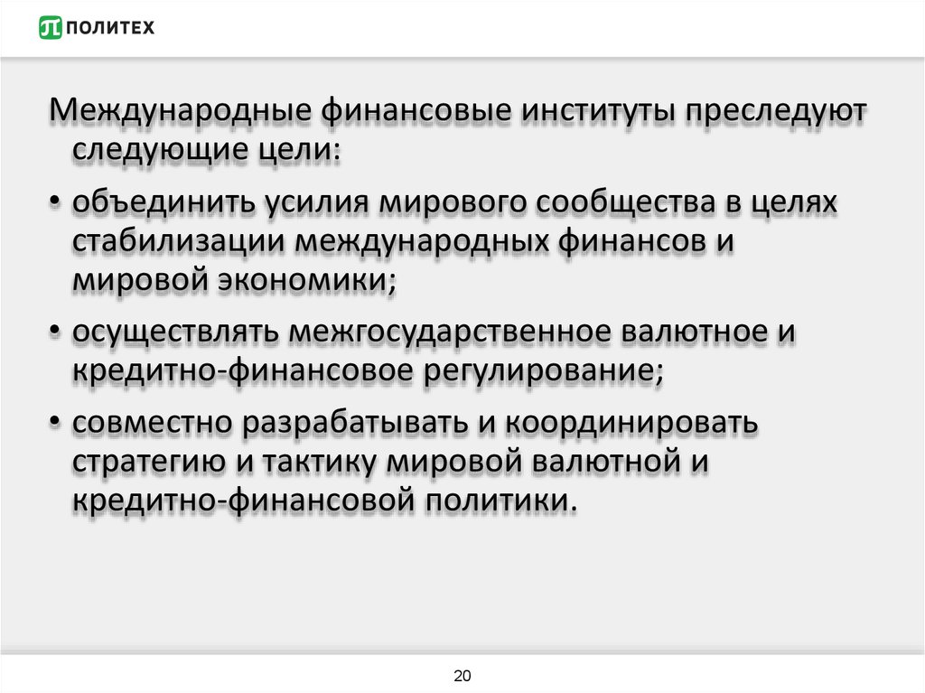 Международные финансовые институты преследуютследующие цели: