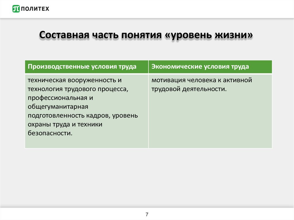 Составная часть понятия «уровень жизни»Производственные условия труда