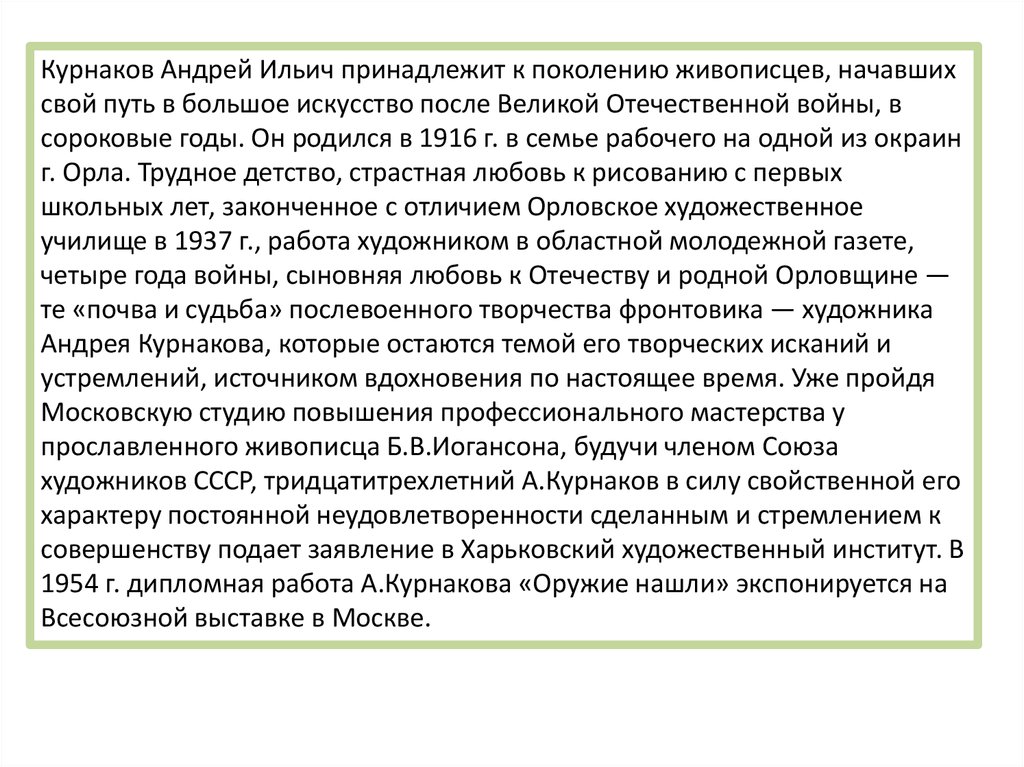 Курнаков Андрей Ильич принадлежит к поколению живописцев, начавшихсвой путь в большое искусство после Великой Отечественной войны, в