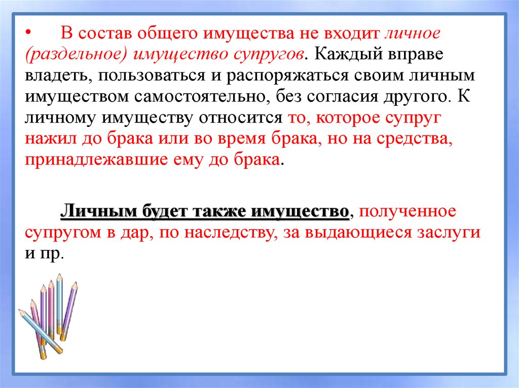 • В состав общего имущества не входит личное(раздельное) имущество супругов. Каждый вправе