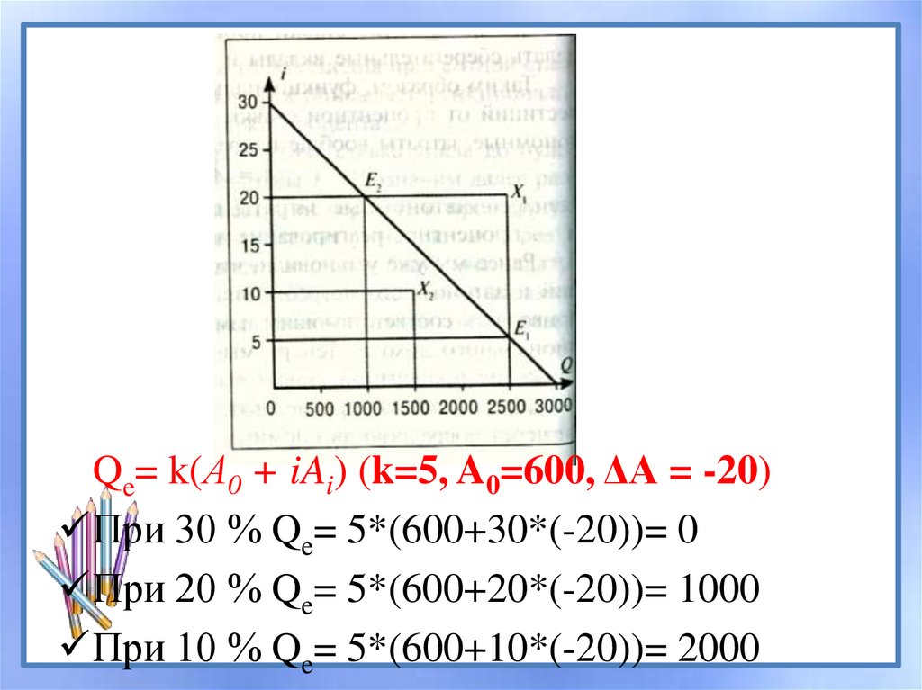 Qe= k(А0 + iAi) (k=5, A0=600, ΔА = -20)При 30 % Qe= 5*(600+30*(-20))= 0