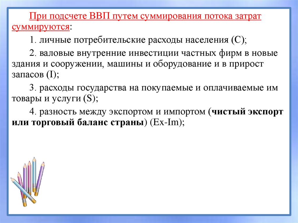 При подсчете ВВП путем суммирования потока затратсуммируются: