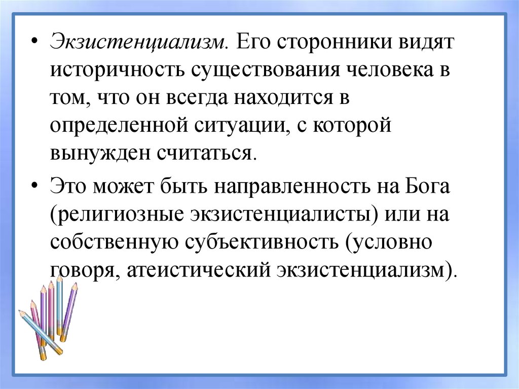 • Экзистенциализм. Его сторонники видятисторичность существования человека в