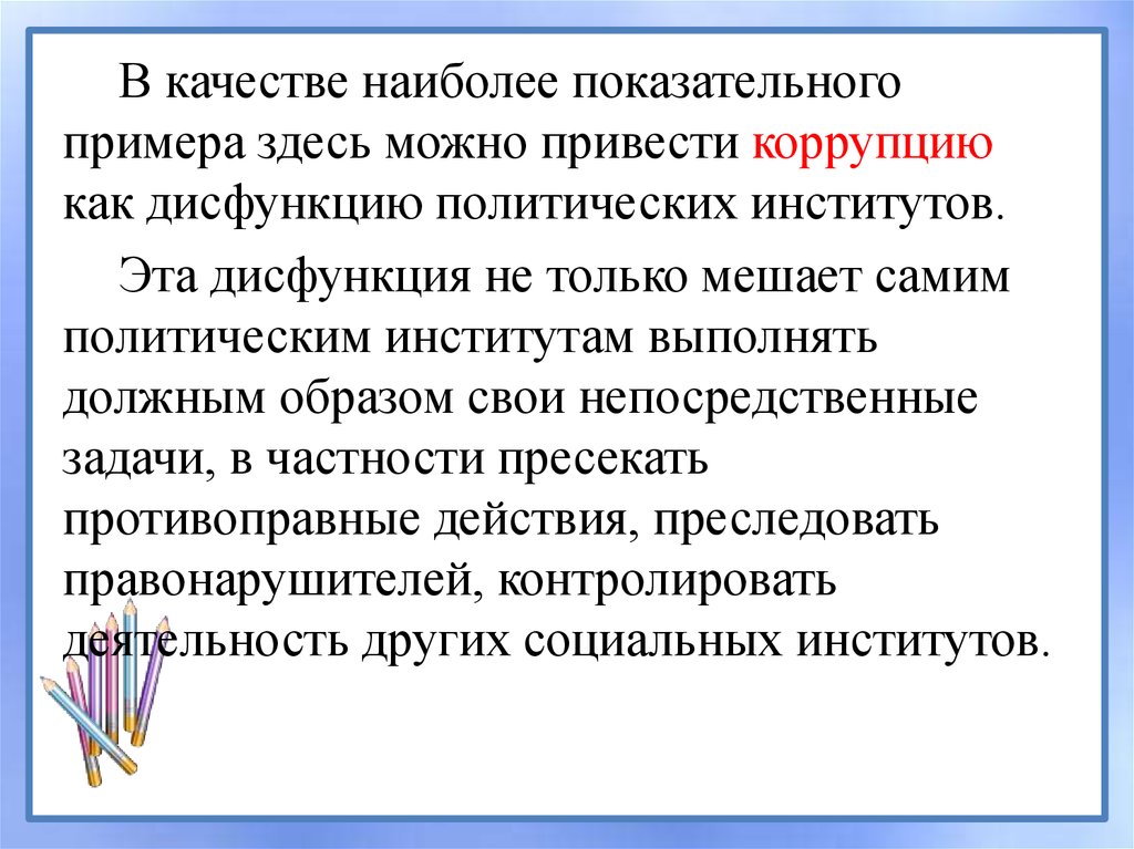 В качестве наиболее показательногопримера здесь можно привести коррупцию