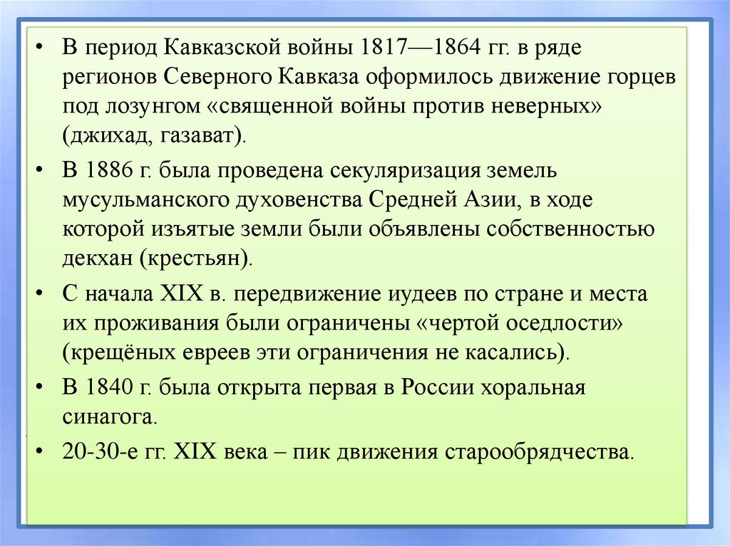 • В период Кавказской войны 1817—1864 гг. в рядерегионов Северного Кавказа оформилось движение горцев