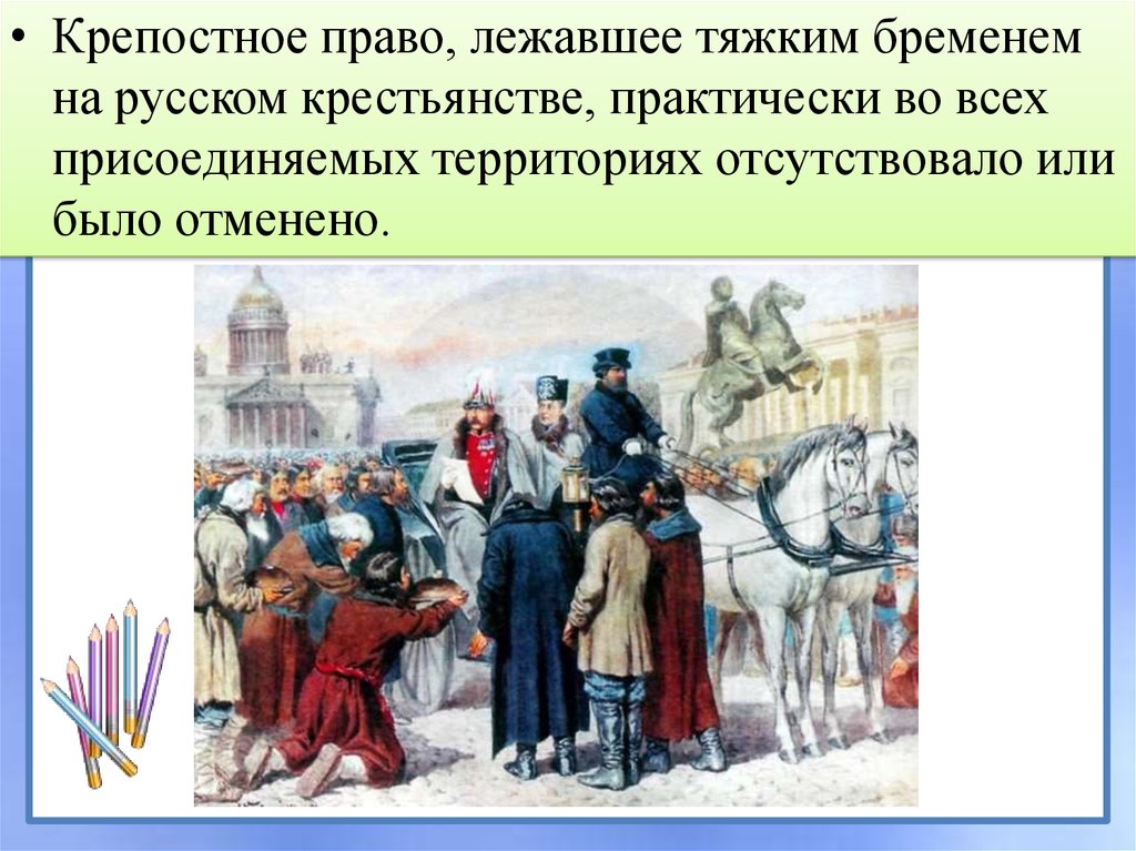• Крепостное право, лежавшее тяжким бременемна русском крестьянстве, практически во всех