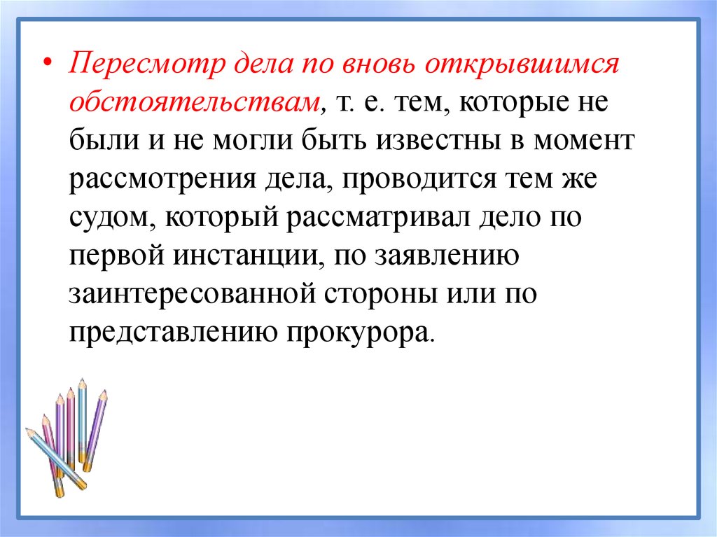 • Пересмотр дела по вновь открывшимсяобстоятельствам, т. е. тем, которые не