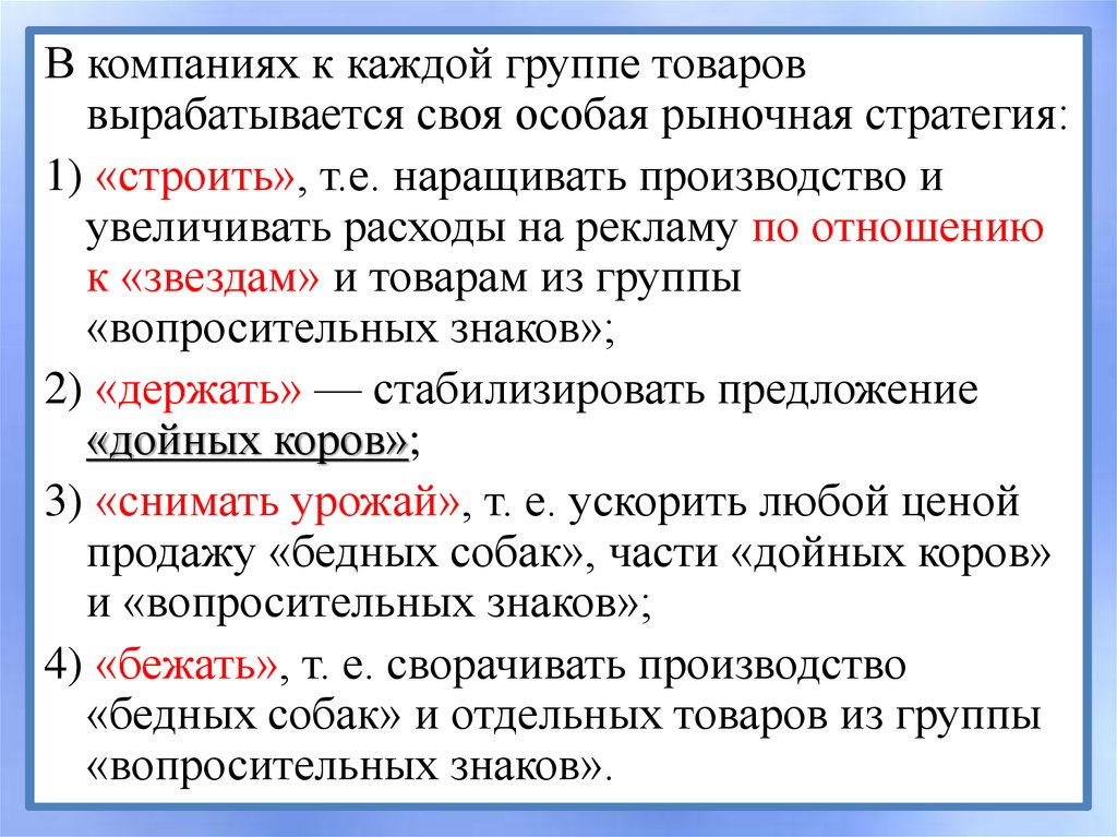 В компаниях к каждой группе товароввырабатывается своя особая рыночная стратегия: