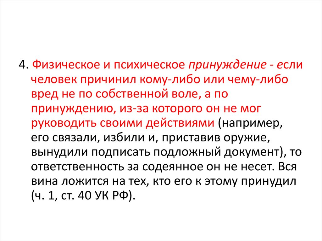 4. Физическое и психическое принуждение - есличеловек причинил кому-либо или чему-либо