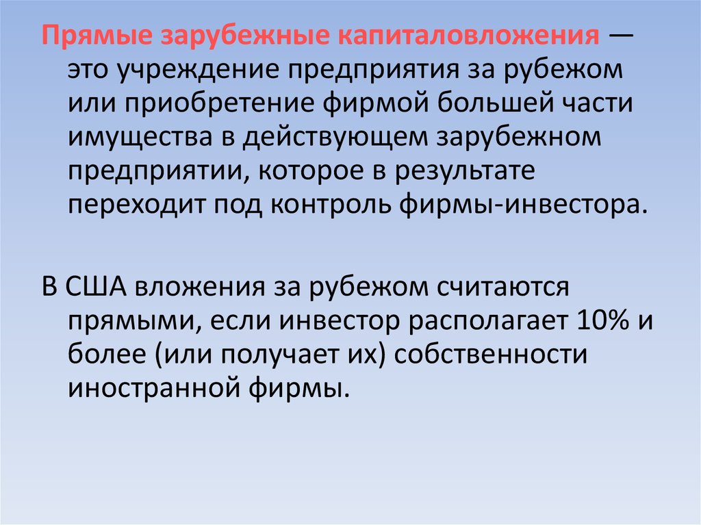 Прямые зарубежные капиталовложения —это учреждение предприятия за рубежом