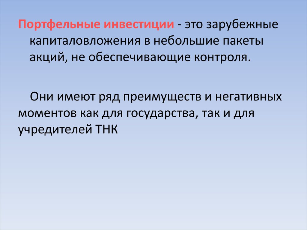 Портфельные инвестиции - это зарубежныекапиталовложения в небольшие пакеты
